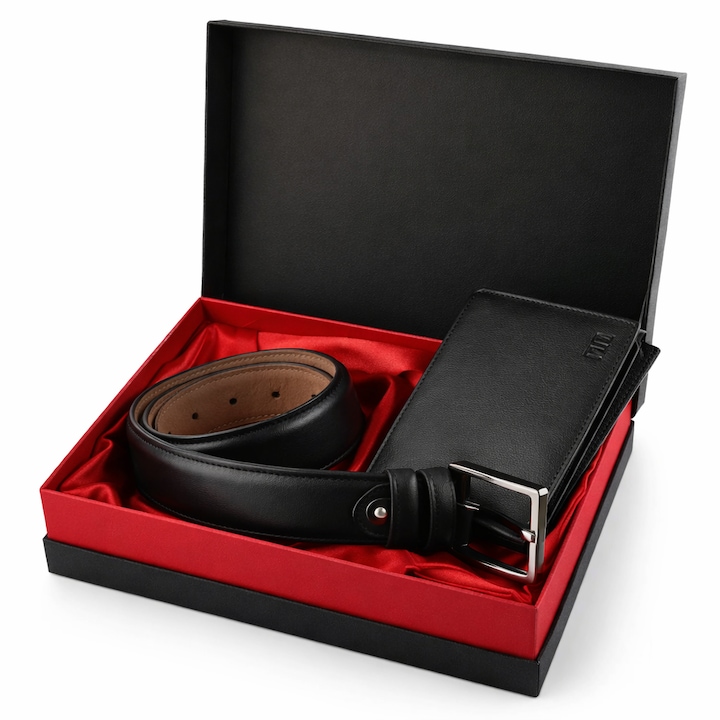 Set cadou pentru barbati, format din curea si portofel tip piele, in culoare neagra, prezentate intr-o cutie eleganta cu aspect frumos.