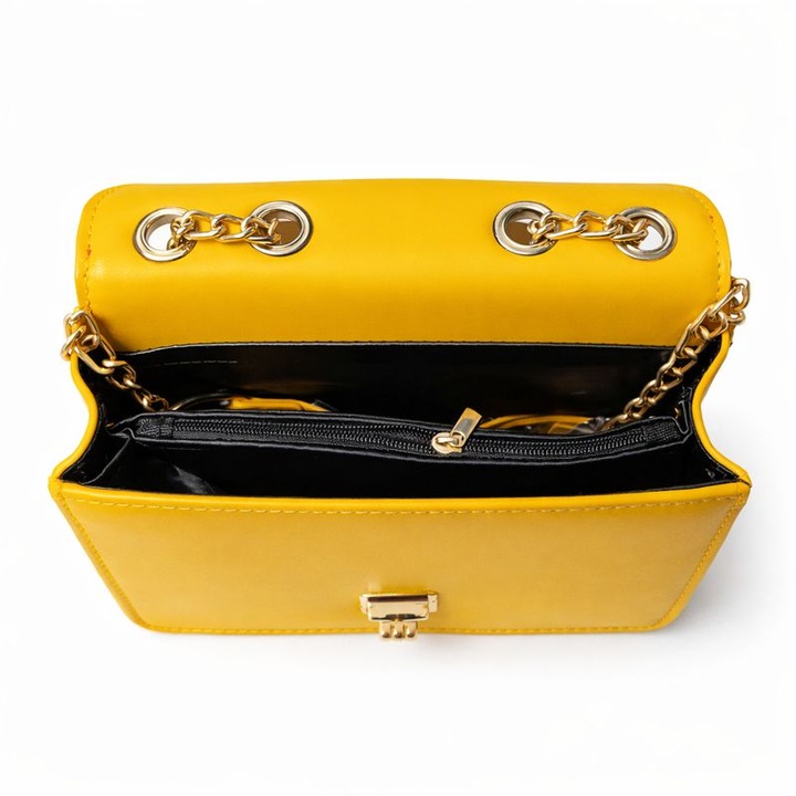 - Geanta moderna culoare galben mustar, cu lant auriu si compartimente practice, dimensiune 19,5 x 14 x 8 cm