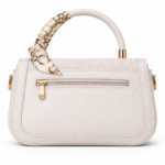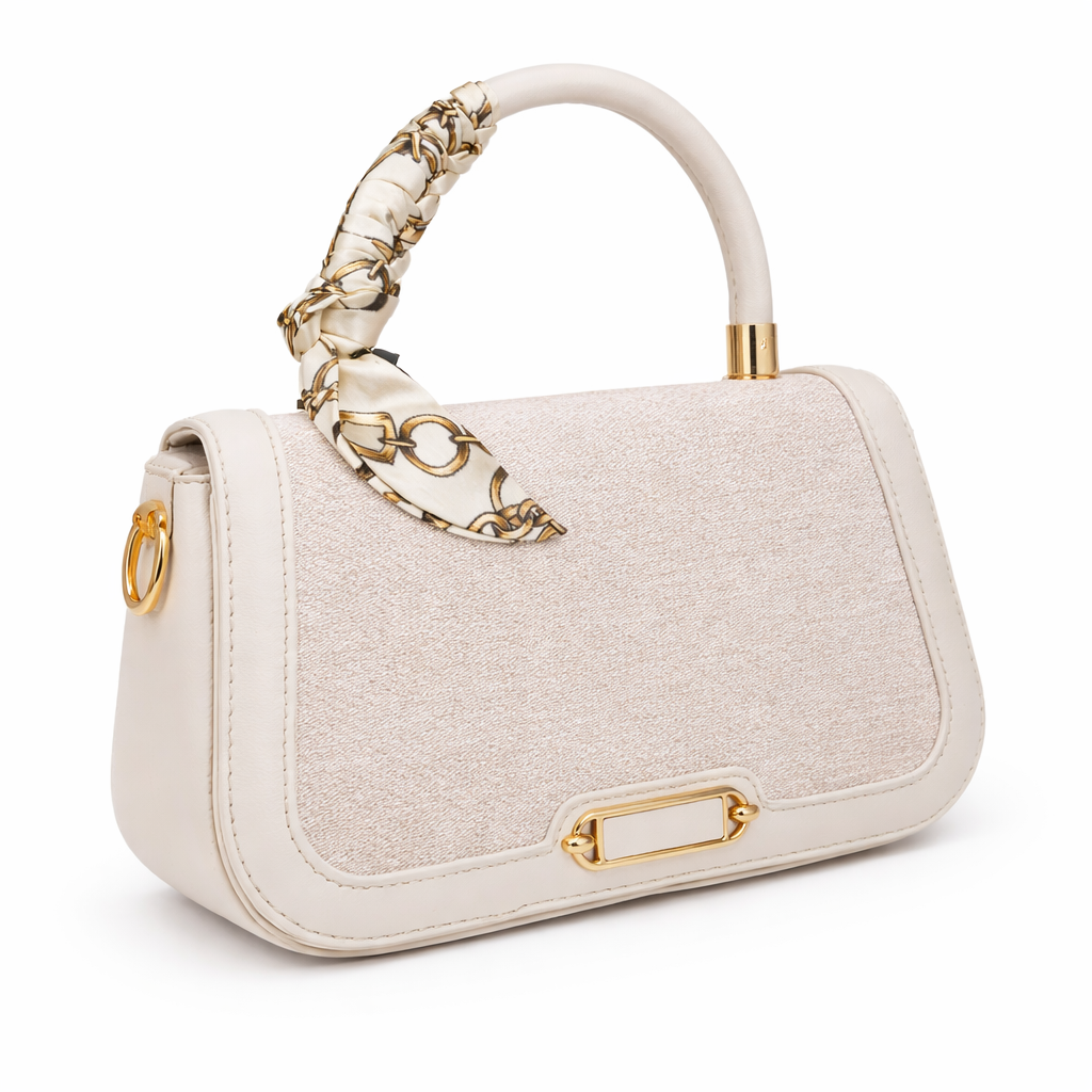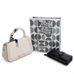 Geanta se remarca prin designul sau rafinat, in nuanta gri, cu textura fina si finisaje atent lucrate. Manerul rigid este accesorizat cu un esarfa decorativa chic, iar elementele metalice aurii completeaza perfect aspectul premium. Forma compacta si structurata o face ideala pentru tinute elegante sau casual-chic.
