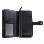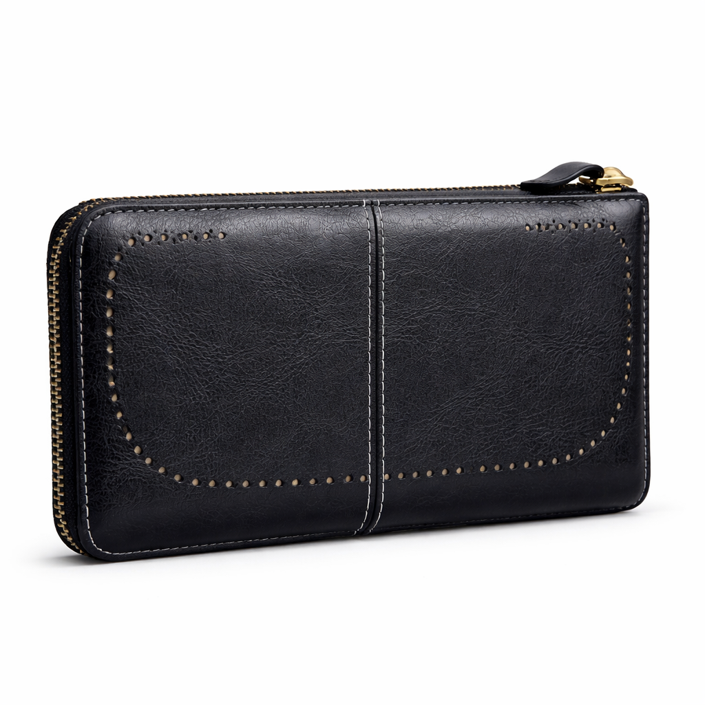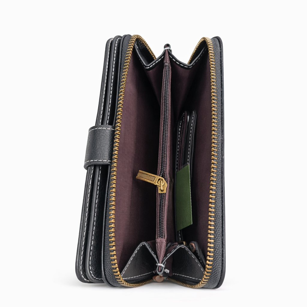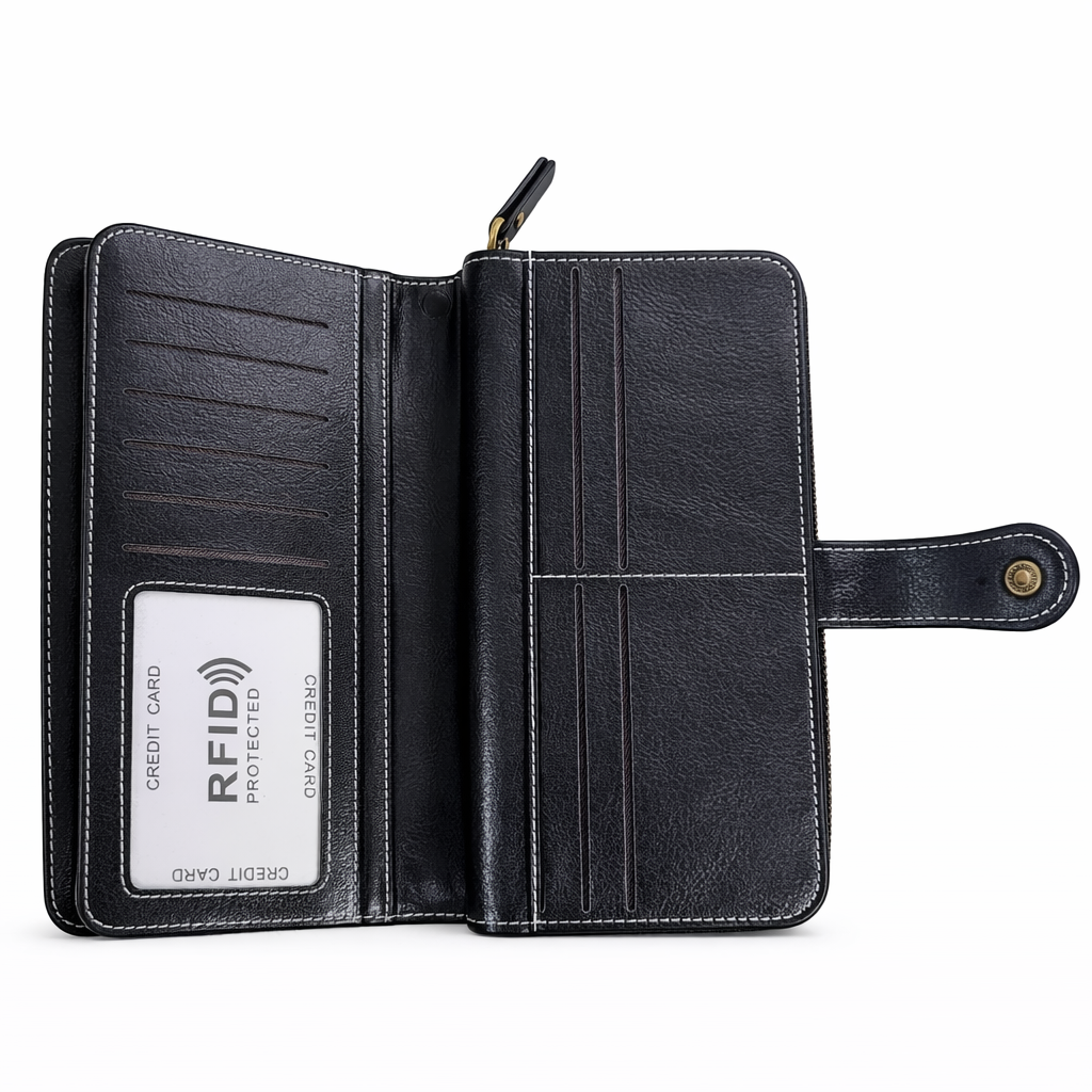 Acest portofel imbina perfect eleganta cu functionalitatea, fiind realizat din piele sintetica de calitate superioara. Este conceput pentru organizare eficienta, oferind multiple compartimente pentru carduri (pana la 24), toate protejate prin tehnologie RFID pentru siguranta sporita. Include spatii dedicate pentru acte importante (carte de identitate, permis, talon), precum si un compartiment pentru telefon. Bancnotele pot fi depozitate in cele doua buzunare lungi, iar monedele intr-un buzunar separat cu fermoar.