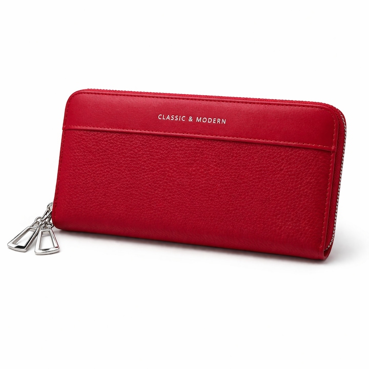 • Portofel lung tip zip-around, spatios, cu compartimente pentru carduri, bancnote si monede, dimensiune 20 x 10 x 3,5 cm