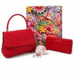 Set cadou elegant pentru femei – geanta rosie + portofel rosu + ogllinda de buzunar cu breloc + punga cadou