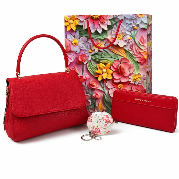 Set cadou elegant pentru femei - geanta rosie + portofel rosu + ogllinda de buzunar cu breloc + punga cadou