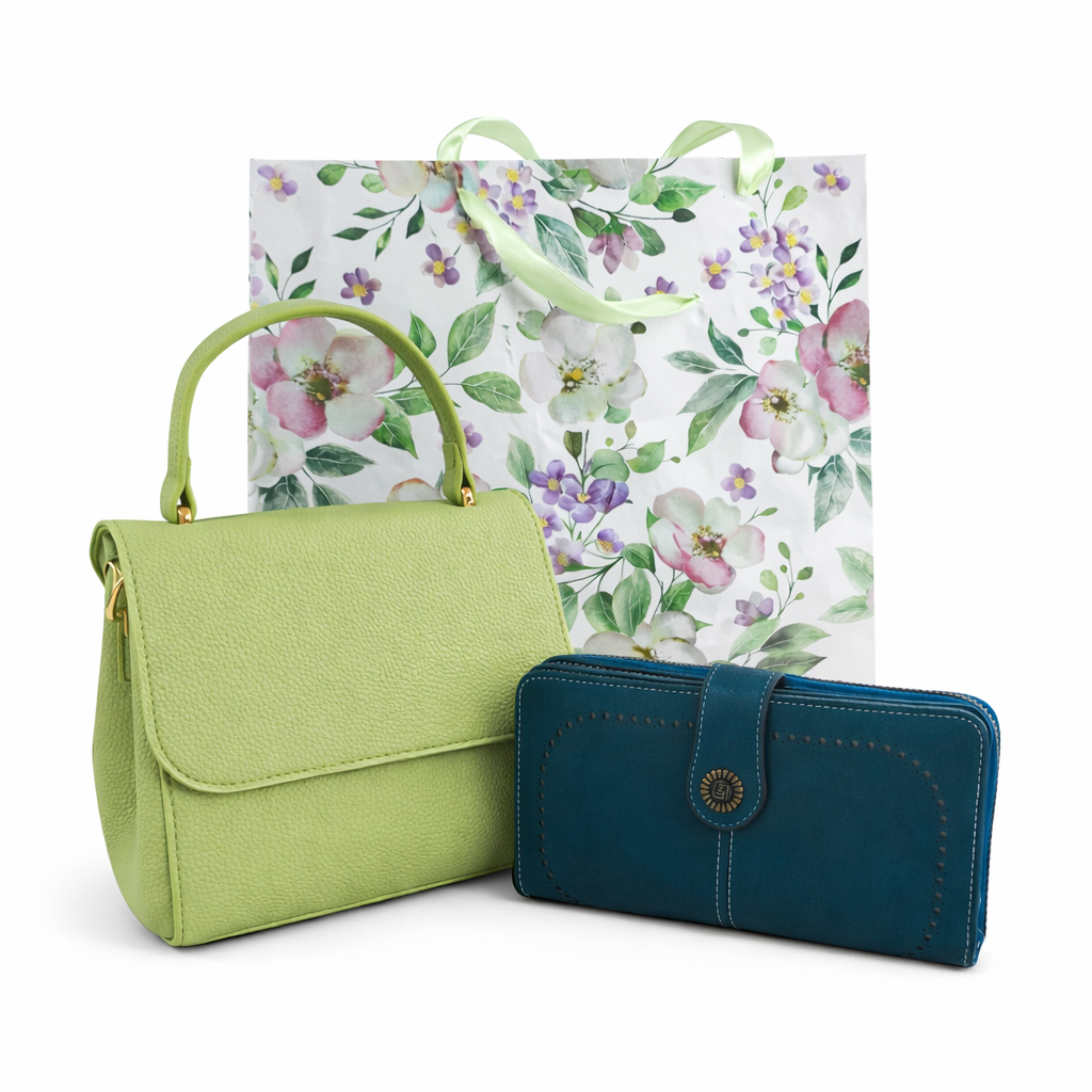 Set Geanta Eleganta Verde Lime Soft/ Fistic + Portofel Albastru/ Peacock Blue cu protectie RFID + Punga Cadou Florala
